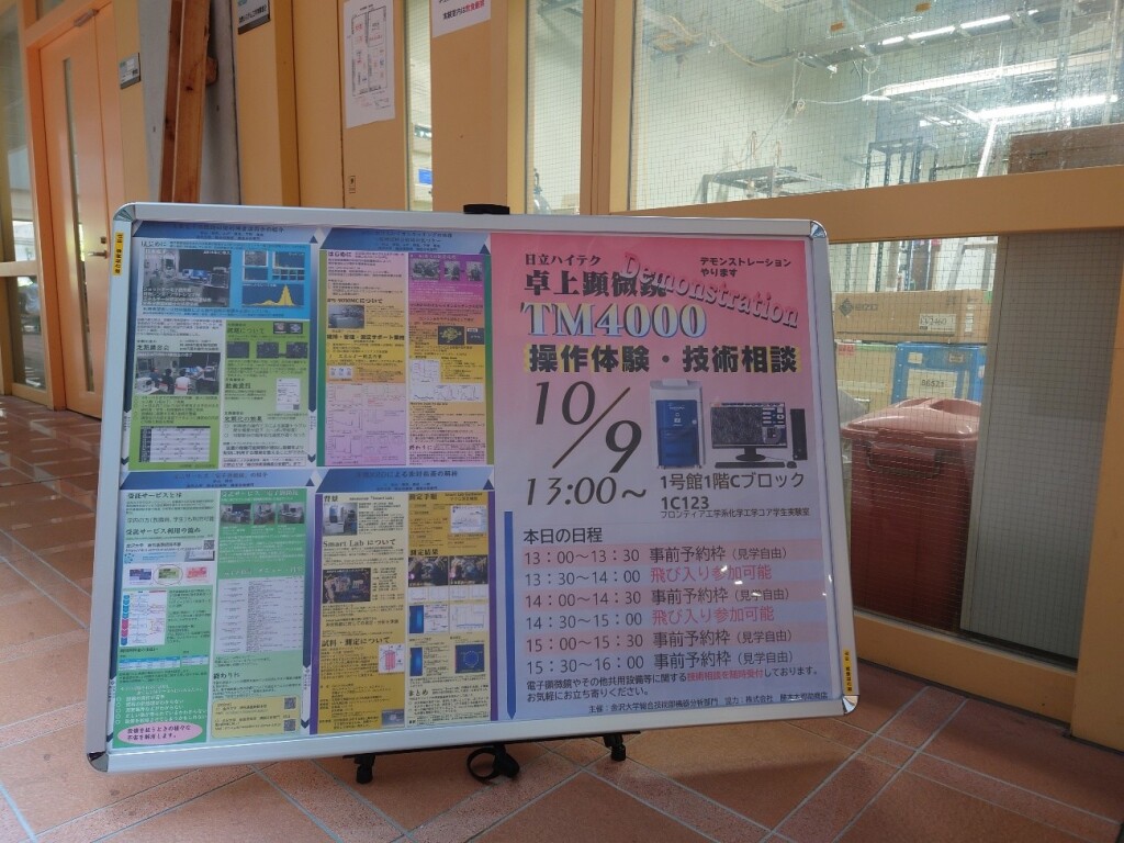 令和7年10月9日(木)に卓上顕微鏡TM4000Plus(日立ハイテク)のデモンストレーションを実施しました。機器分析部門の主催により、教員・学生・技術職員など学内の多様な関係者が電子顕微鏡の観察・分析技術に触れ、その活用可能性を体験する機会として開催されたものです。